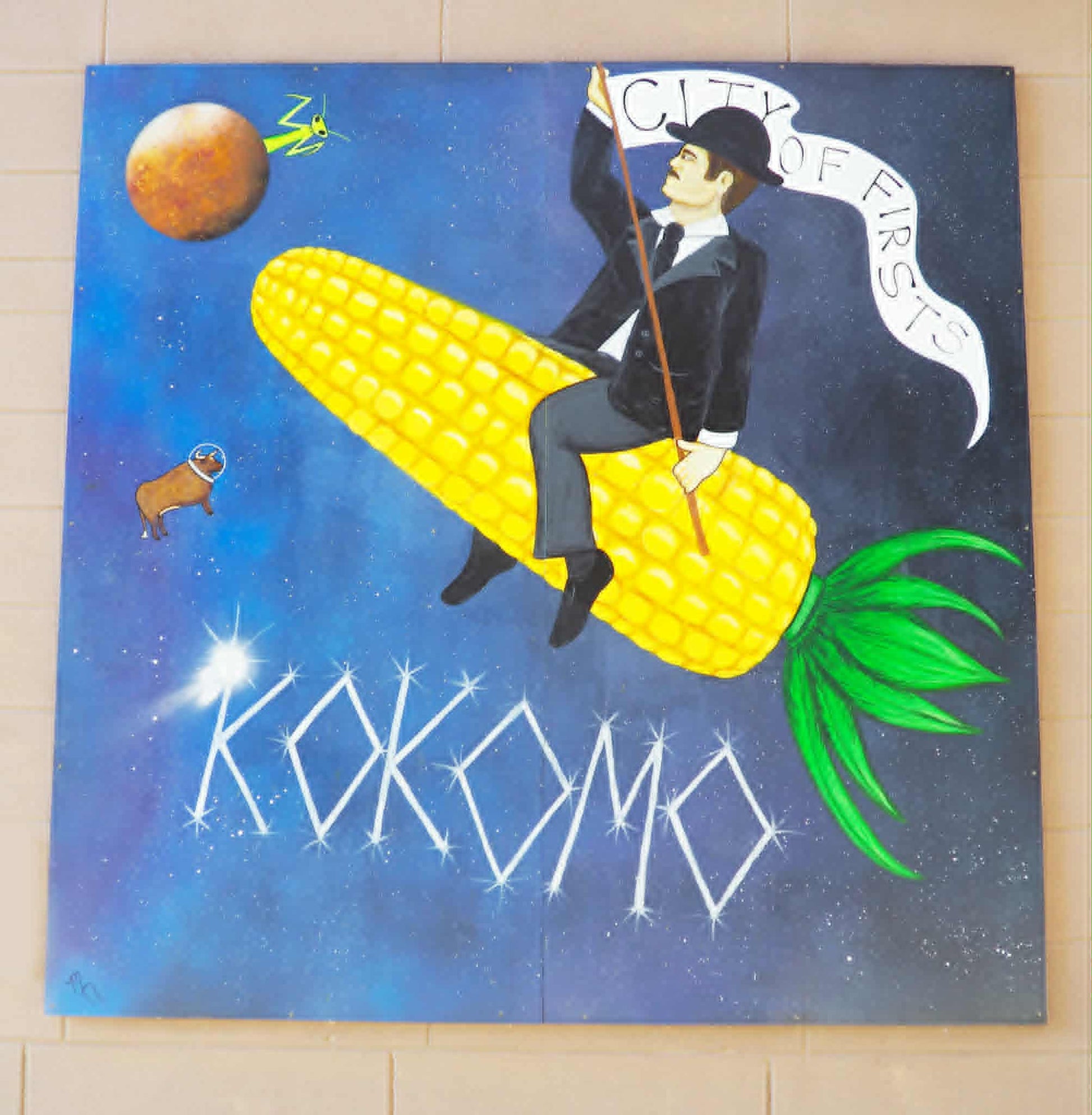 This mural bridges two places that have defined my life: Kokomo, Indiana—“City of Firsts”—and Starbase, Texas, a new frontier of firsts in space exploration. Elwood Haynes, riding a corn-built rocket toward Mars, recalls the inventive spirit of my hometown. Kokomantis and Old Ben drift through the scene as echoes of Kokomo’s lore, reimagined as cosmic myth. The work is also threaded with personal connections: my husband and I met at Purdue, a university renowned for shaping space innovation, a foreshadowing of the life we would later build in Starbase. My grandfather’s family even worked alongside Elwood Haynes himself, adding a generational link to this tale of invention. Painted with a touch of Kahlo-inspired surrealism, the piece nods gently to making my own dreams tangible while following my husband’s path of engineering achievement, not unlike Kahlo's life of personal success with a successful spouse. Though rooted in Kokomo, this piece looks outward. It has become the companion to a forthcoming mural in Starbase, together forming a pair of works that reflect the journey between two “Cities of Firsts”—from cornfields to rockets, from memory to myth.