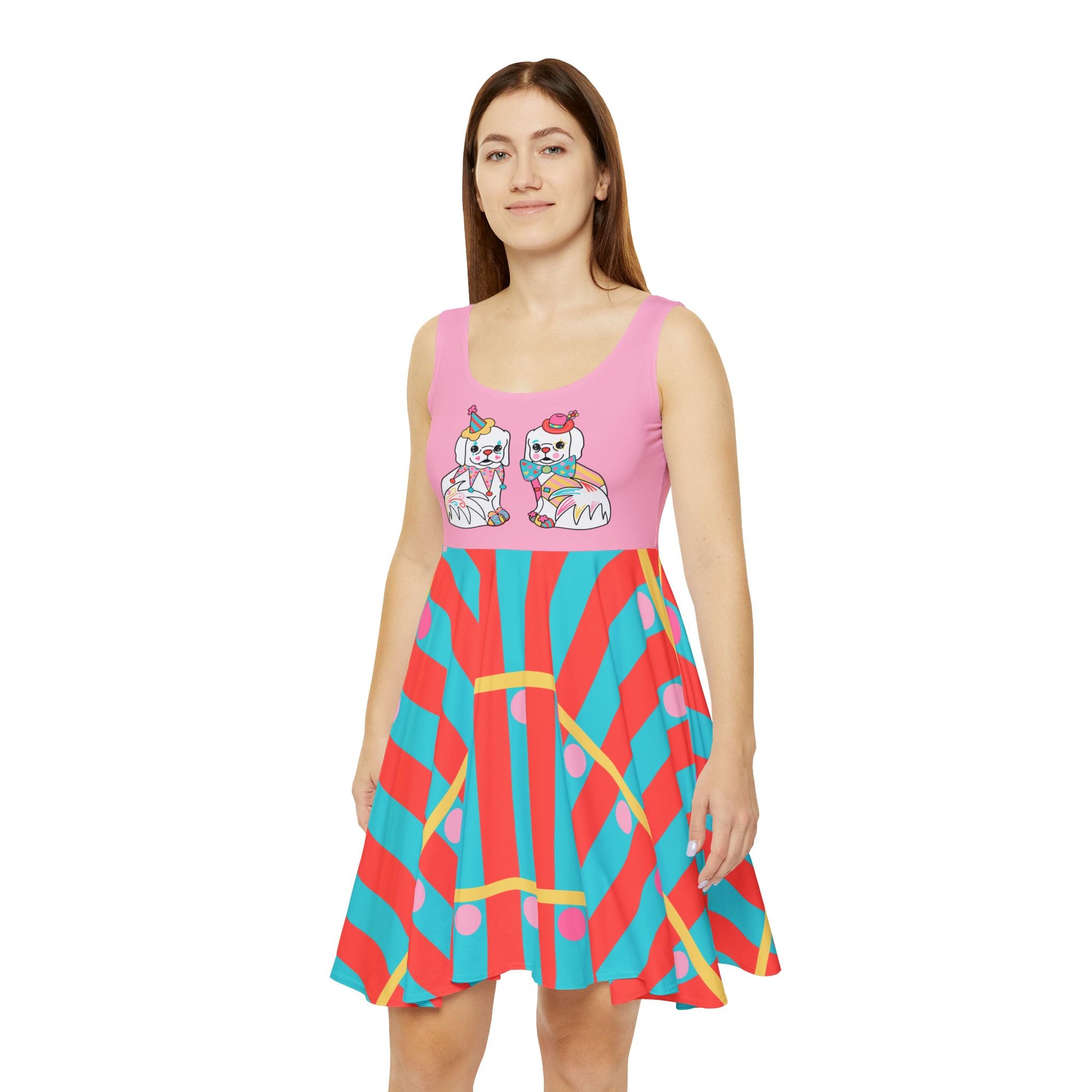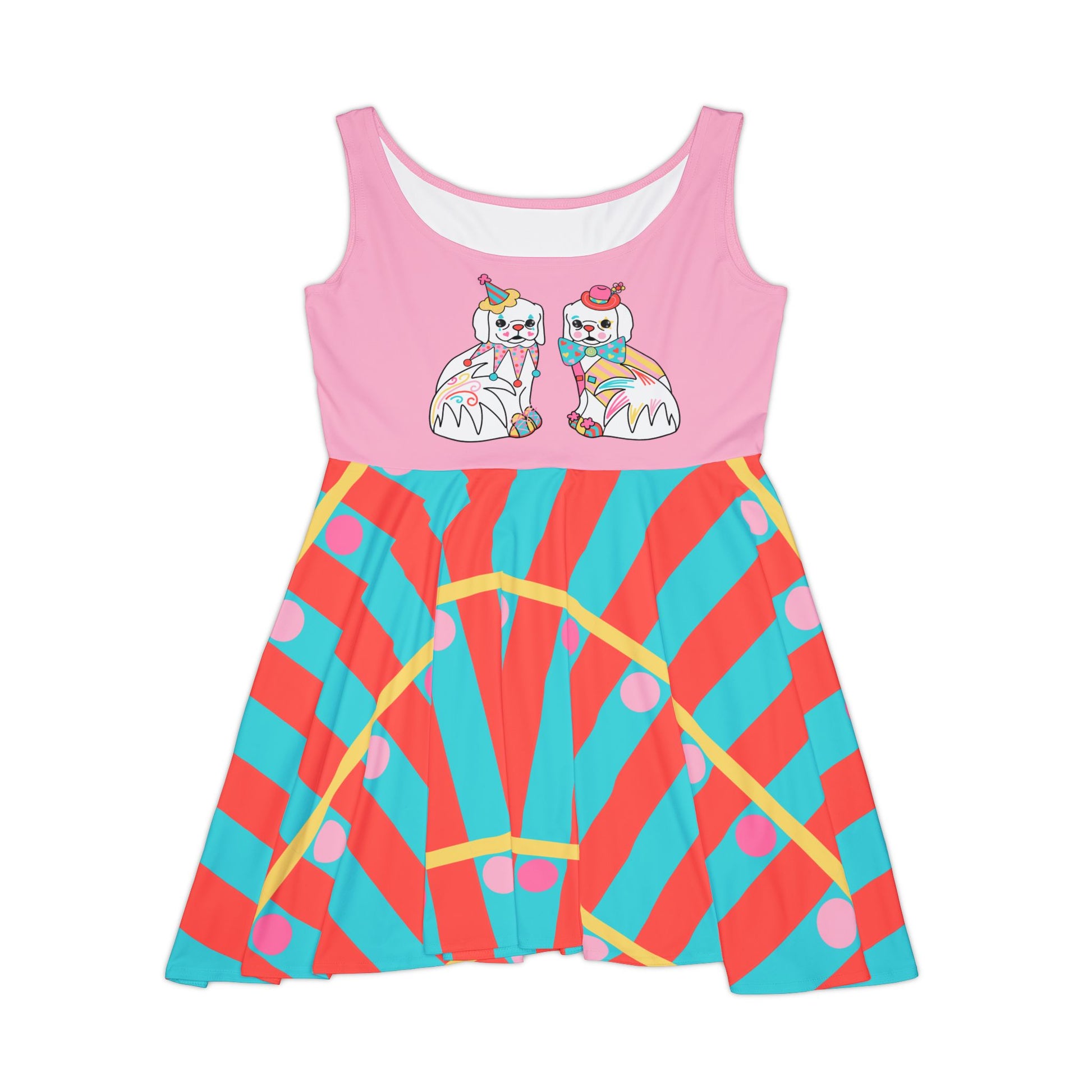 Time for The Peke Show! Its Clowncore. Its MCM. Its two little doggies clowning around. Its our namesake pekingese pups as Staffordshire Spaniel Style figurines straight from the 60s with a clowncore twist makes this one of a kind design by Mollee Noren. Wear it on this comfy swing dress fancied up or down! Whether it's hitting the town or lounging around, this custom skater dress brings an unmatched flair to any woman's wardrobe. Made with a high-quality, 290gsm fabric blend that is 83% polyester, 17% spandex, it's comfy, stretchy and a perfect match to any occasion. Add your art in an all-over print and create an instant favorite for any day of the week. .: Material: 83% polyester, 17% spandex .: Medium-heavy fabric (8.5 oz /yd² (290 g/m²)) .: Mid-length .: Seam thread color automatically matched to design (black or white) .: Assembled in the USA from globally sourced parts .: *Asymmetrical skirt (in places could be longer or shorter)